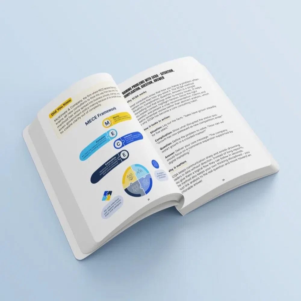 This ebook walks you through the entire consulting approach, from defining and diagnosing complex issues to building strategies that deliver measurable results. It presents step-by-step frameworks used by top consulting firms, adapted for practical use in any organization.